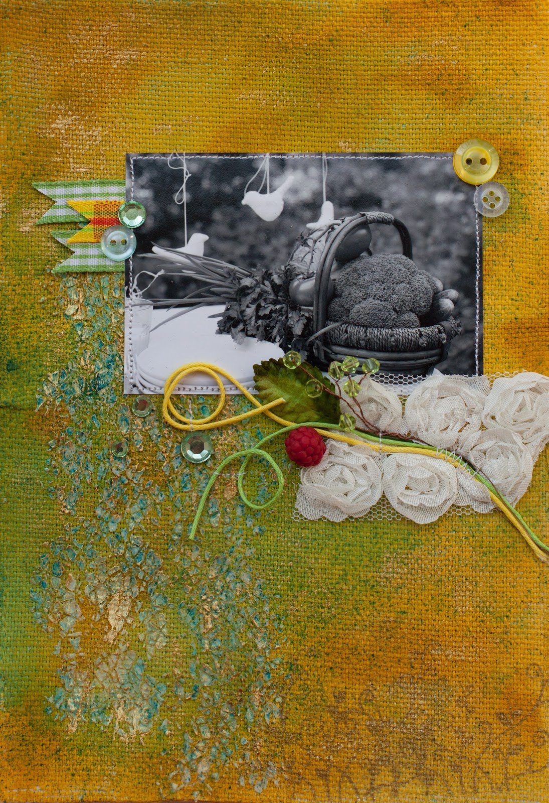Продолжаю участвовать в СП Даши "Тканевый альбом". Мой второй разворот попал в топ! Спасибо, Даша! Как же мне нравится участвовать в этом проекте, сделав очередной разворот, не терпится приняться за еще один :). Заданием для этого разворота была "текстура/фактура". Масок у меня нет и в магазинах ничего подходящего не нашла, поэтому долго думала, чем же ее заменить. В результате решила использовать кружево-паутинку, поверх которого и наносила текстурную пасту. Основа страницы покрыта желтой акриловой краской, по которой прошлась золотистой краской, внизу страницы сделала эмбоссинг золотой пудрой. Поверх страницы побрызгала спреем от Ranger.