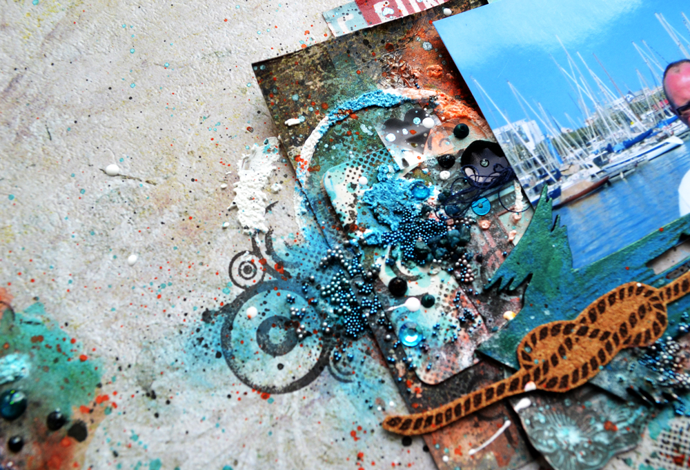 Then all was completely dried I adhered photo and added texture with two differnt micro beads and quartz topping. Chipboard was colored with Tim Holtz crayon and Art-C metallic paint, then I added stamping on it. For this project I also created cork embellishments using stazon ink and Kaisercraft stamps.