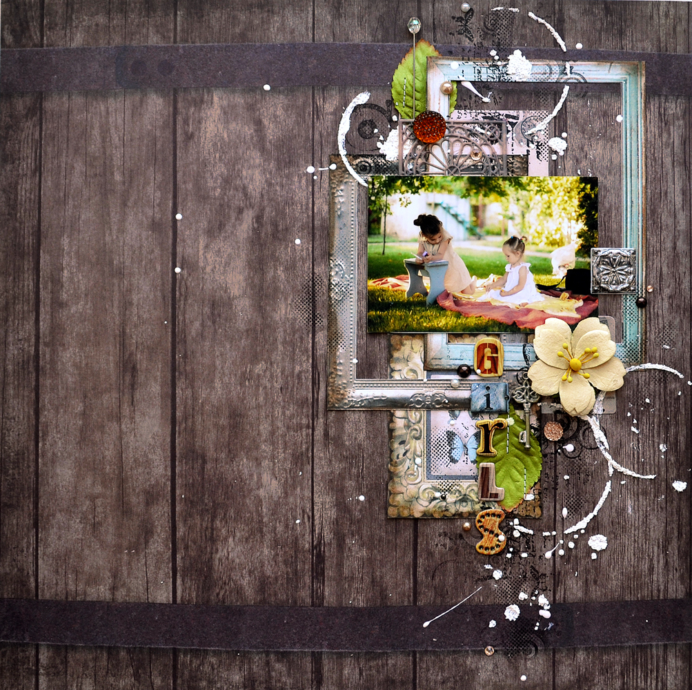 Then adhered randomly pearls and rhinestones on the layout, flower, sparklets, chipboard title and flourishes.